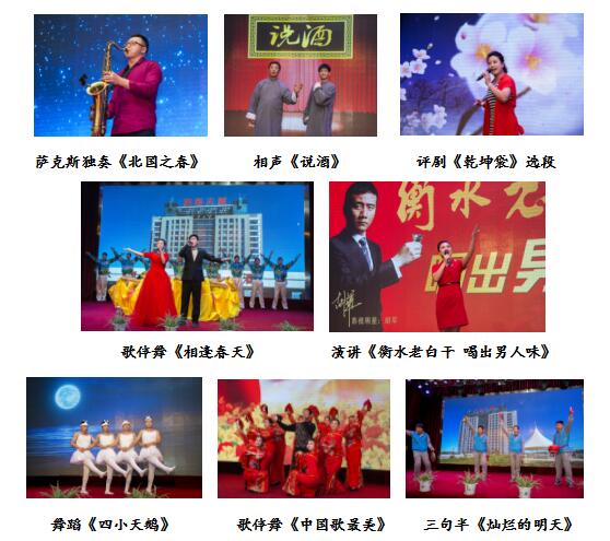 聯(lián)歡會(huì )在公司舞蹈隊帶來(lái)的《相逢春天》中正式拉開(kāi)帷幕,表達了職工對公司明天最美好的祝福。緊接著(zhù),動(dòng)力車(chē)間的劉善春一首悠美動(dòng)聽(tīng)的薩克斯獨奏《北國之春》,讓觀(guān)眾聽(tīng)的如癡如醉,仿佛聞到了春天的氣息。制酒二車(chē)間沈明光、趙世威帶來(lái)的相聲《說(shuō)酒》,以詼諧幽默的說(shuō)詞,向觀(guān)眾闡述了自古至今“酒”成就了詩(shī)人許多關(guān)于“酒”的詩(shī)詞佳作。包二車(chē)間和鳳雙帶來(lái)的評劇《乾坤袋》選段讓大家領(lǐng)略到了評劇的魅力。營(yíng)銷(xiāo)公司谷麗君也把參加全國第四屆品牌故事演講比賽的作品帶到了舞臺上,《衡水老白干 喝出男人味》,向我們娓娓講述了解放前老一輩的老白干人英勇抗日,不屈不撓的抗戰精神,用血性、責任、擔當,將燕趙兒女的骨氣、豪氣和壯氣展現的淋漓盡致。制曲車(chē)間的舞蹈《天鵝湖》,精彩滑稽的表演不時(shí)讓觀(guān)眾捧腹大笑。包二車(chē)間何永安、周長(cháng)爽等帶來(lái)的歌伴舞《中國歌最美》,向觀(guān)眾傳遞了中國歌的魅力。制酒一車(chē)間郭金健等帶來(lái)的三句半《燦爛的明天》,將公司2016年所做出的成績(jì)一一做了匯報,使廣大職工更加了解企業(yè)發(fā)展狀況。