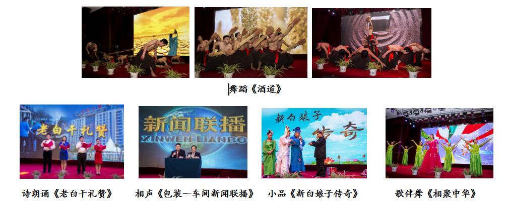 公司舞蹈隊帶來(lái)的舞蹈《酒道》,以逼真的表演將老白干酒文化呈現給觀(guān)眾,更把我們老白干精湛的釀酒技藝用肢體語(yǔ)言演繹的惟妙惟肖。詩(shī)朗誦《老白干禮贊》,高度贊揚了衡水老白干建廠(chǎng)七十周年,一代代老白干人一路走來(lái)披荊斬棘,繼承傳統、開(kāi)拓創(chuàng )新,譜寫(xiě)成老白干最響亮的贊歌。營(yíng)銷(xiāo)公司崔艷芳、劉康康帶來(lái)的小品《新白娘子傳奇》,搞笑滑稽的動(dòng)作,奪人眼球,令觀(guān)眾拍手叫好。包裝一車(chē)間袁文興、貢愛(ài)華帶來(lái)的相聲《包裝一車(chē)間新聞聯(lián)播》,以幽默的語(yǔ)言,夸張的表情,使現場(chǎng)氣氛異?;钴S。最后,技術(shù)中心皮寒玉帶來(lái)歌伴舞《相聚中華》,聯(lián)歡會(huì )在最強音的旋律中圓滿(mǎn)結束。